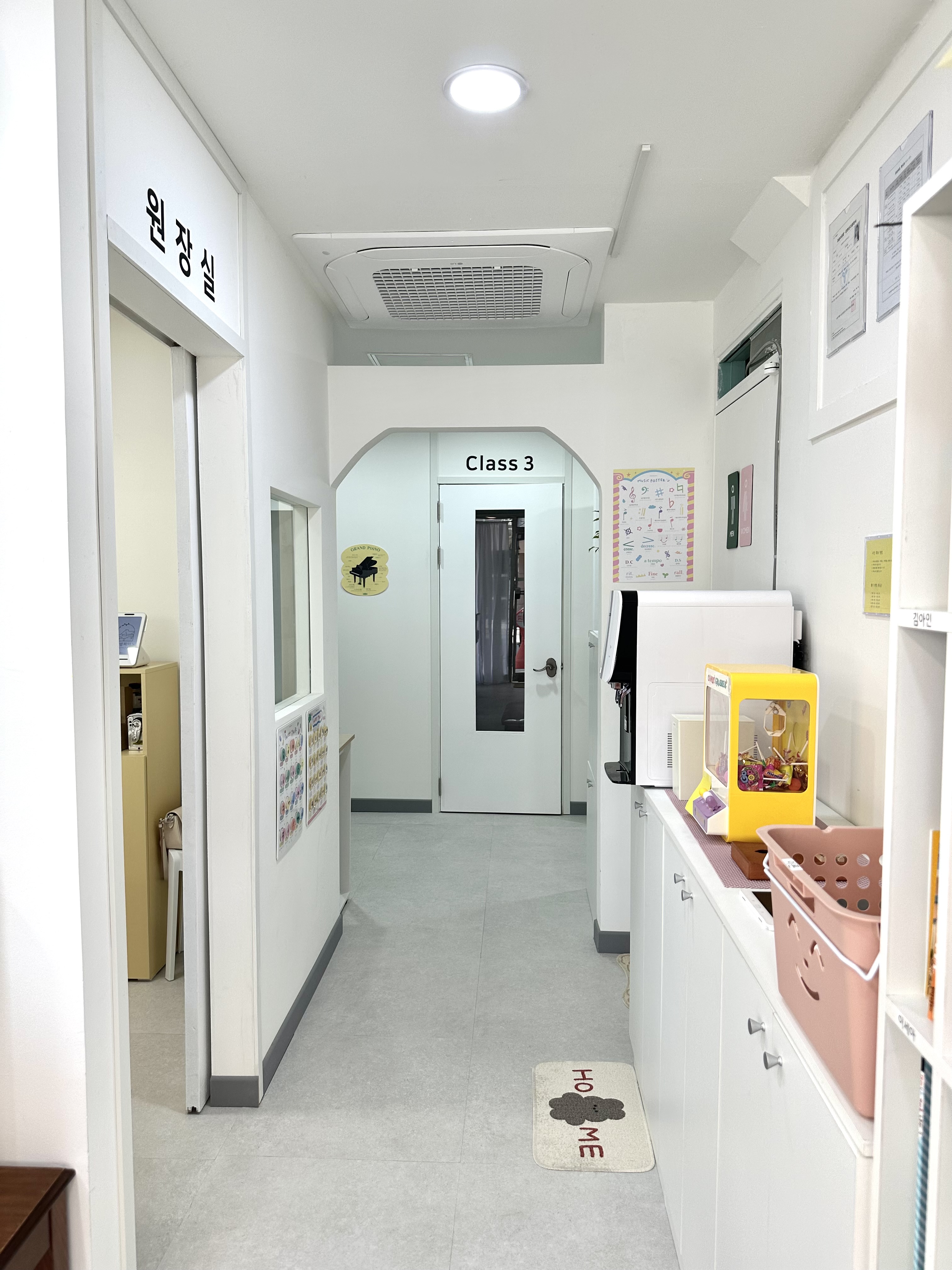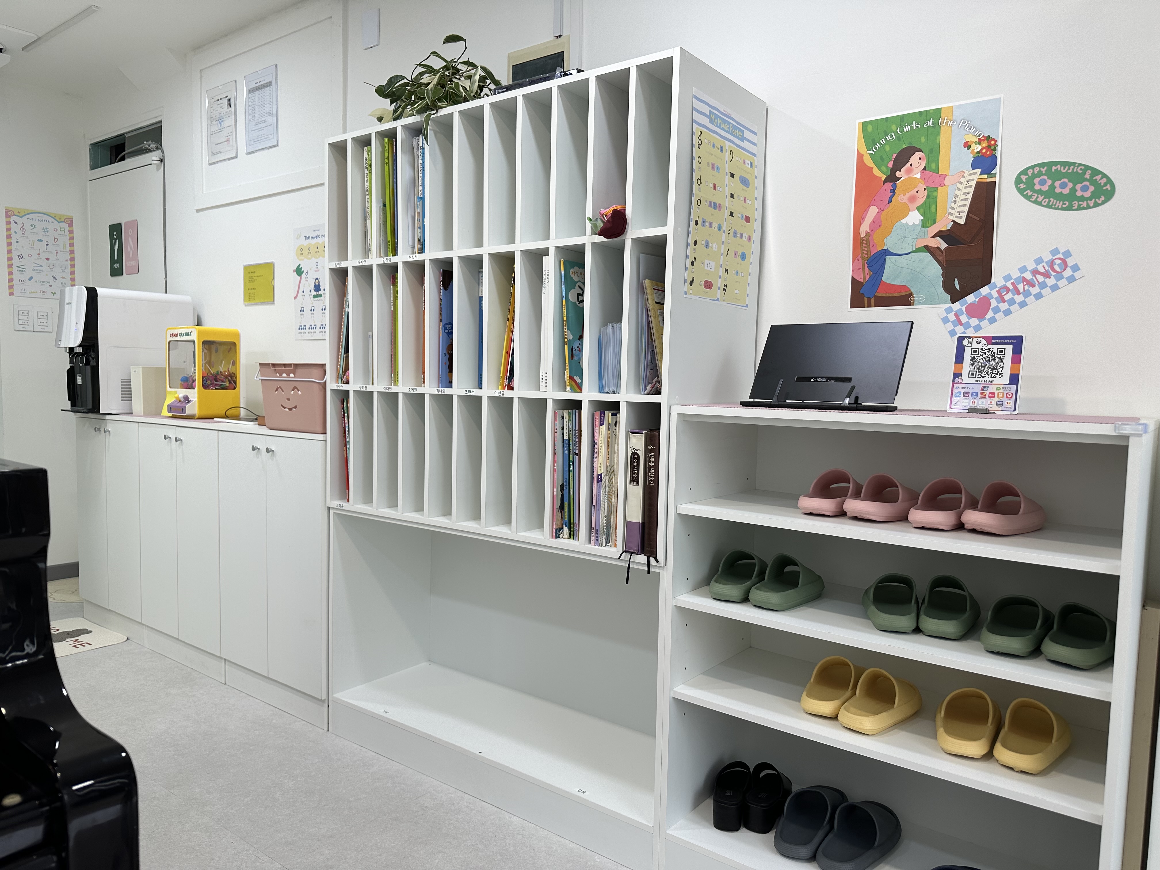 카페 같은 분위기의 15평 음악학원 인테리어 (위례 윤슬피아노 음악교습소) 현관 – 깔끔한 신발장과 환영의 메시지 입구를 들어서면 깔끔하게 정리된 신발장이 맞이해줘요. 하얀 벽면 위에 로고가 부드럽게...