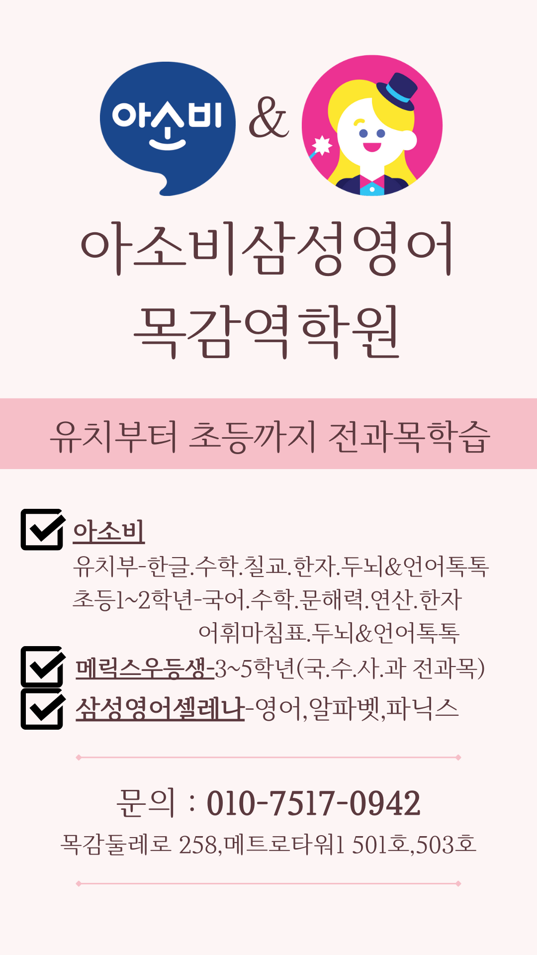 유치부 한글떼기부터 초등1~2학년 아소비, 초3~5학년 전과목 메릭스우등생, 그리고 삼성영어셀레나까지 함께 탄탄하게 공부할 수 있는 아소비삼성영어목감역학원입니다. 우리 아이의 영어학습을 책임져줄 아주...