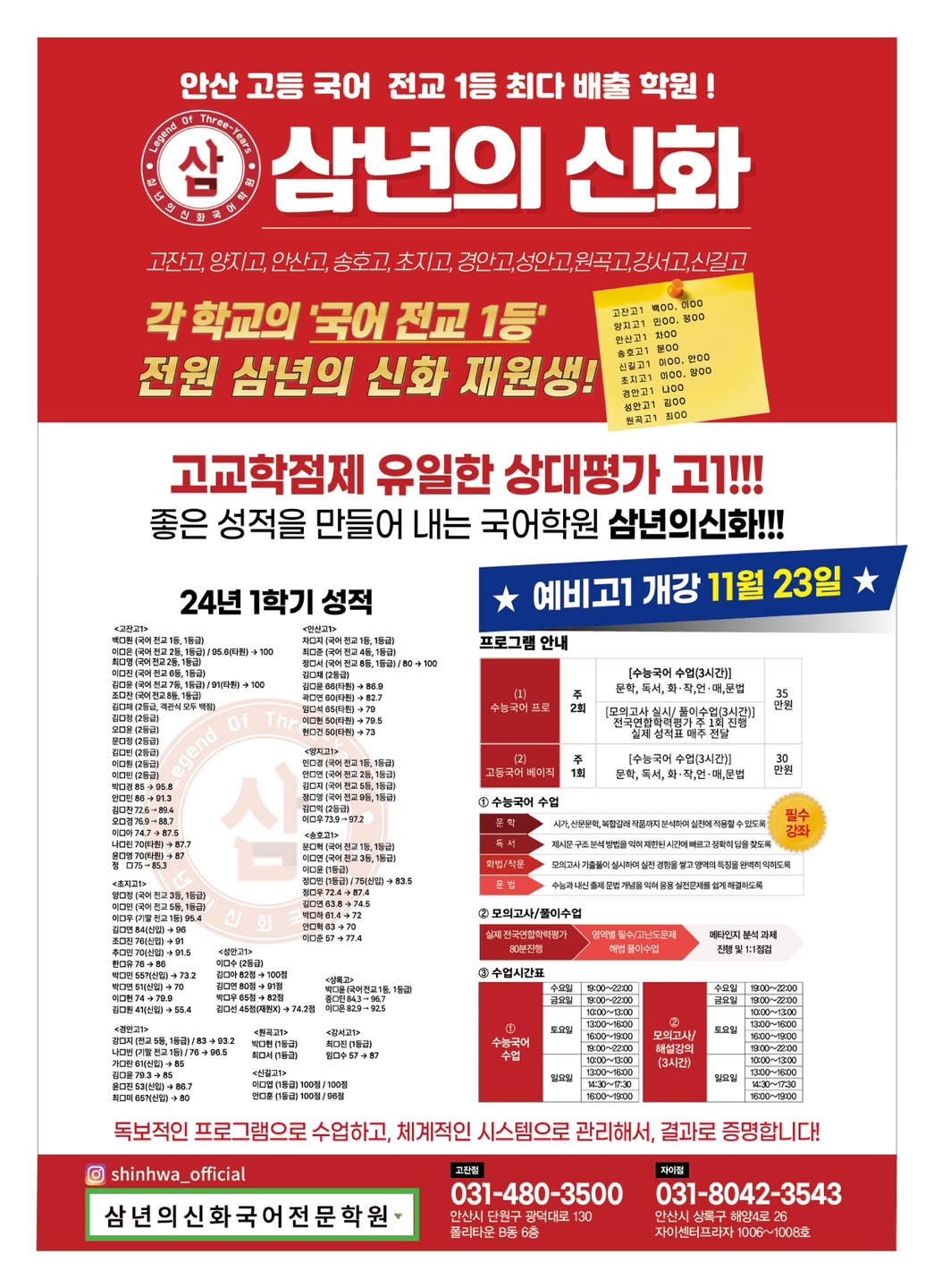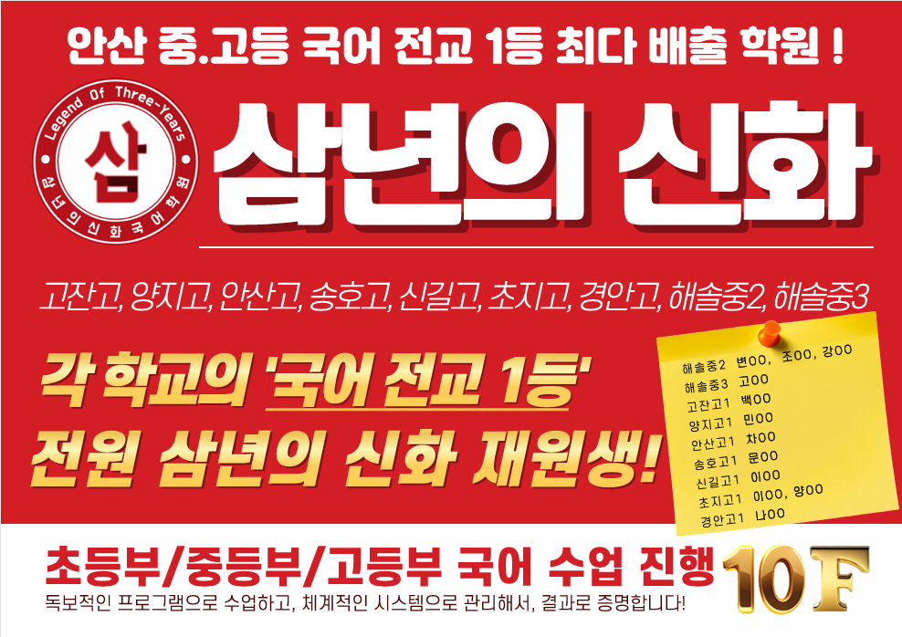 4명, 고잔고 4명이 1등급을 받은 삼년의신화 재원생이다. 삼년의신화 국어전문학원 관계자는... 고등 국어 전교 1등 최다 배출 학원으로 실력을 입증하고 있다. 본점 031-480-3500, 경기 안산시 단원구...