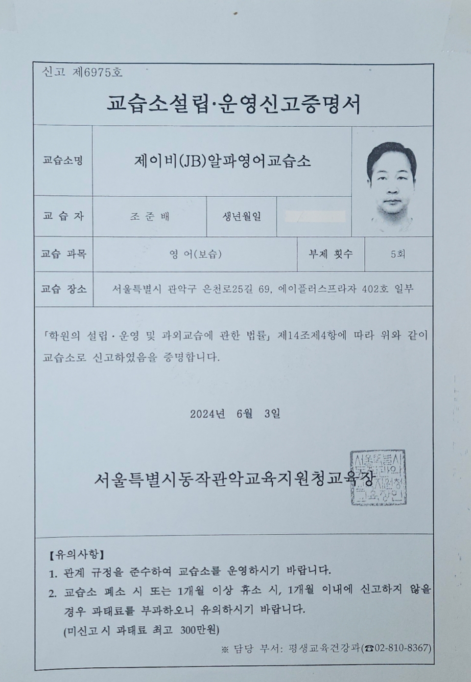 (원) 영어 초등저학년 6명 1080 190.000 190.000 초등고학년 8명 1200 220.000 220.000 중학교 9명 2600 270.... 26년 6월 19일 학원(교습소)설립.운영자(교습자) : 조준배 (서명 또는 인)...