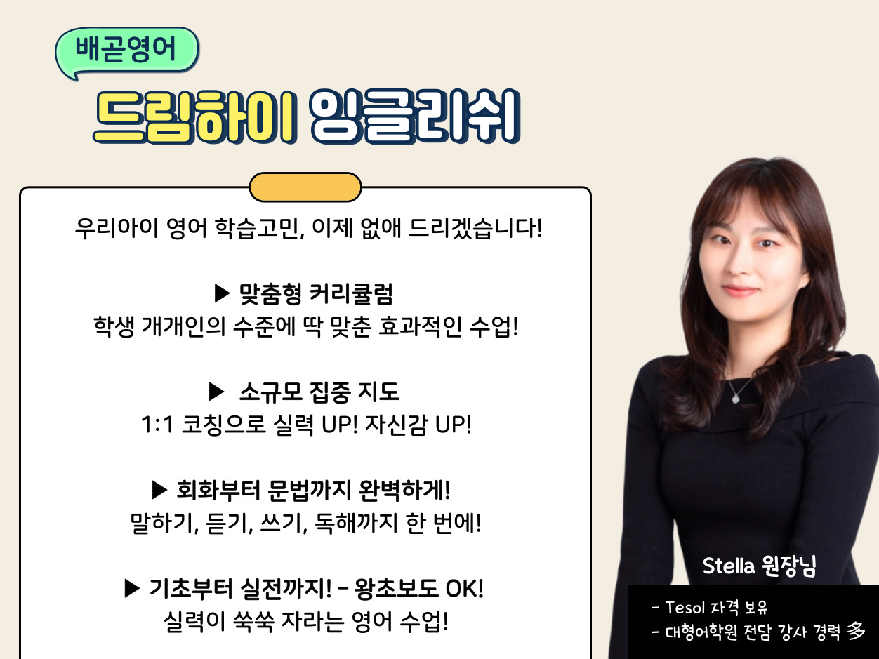 배곧 드림하이영어교습소는 다릅니다! [배곧 중등영어] ✔️한 명 한 명 꼼꼼하게 관리하는 1:1 맞춤형 영어 코칭으로 확실한 변화를 경험하세요! 드림하이 영어 교습소에서는 소수정예 수업의 장점을 최대한...