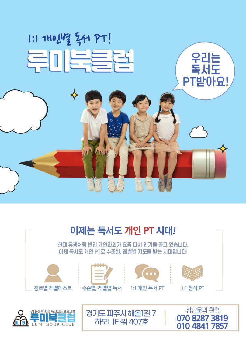 루미북클럽 마린시티독서논술교습소는 23년간의 이룸이독서논술 커리큘럼을 기반으로 독서 70% + 논술·표현 30%의 균형 잡힌 문해력 수업을 통해 아이들의 ‘생각 → 이해 → 표현’까지 이어지는 전 과정을...