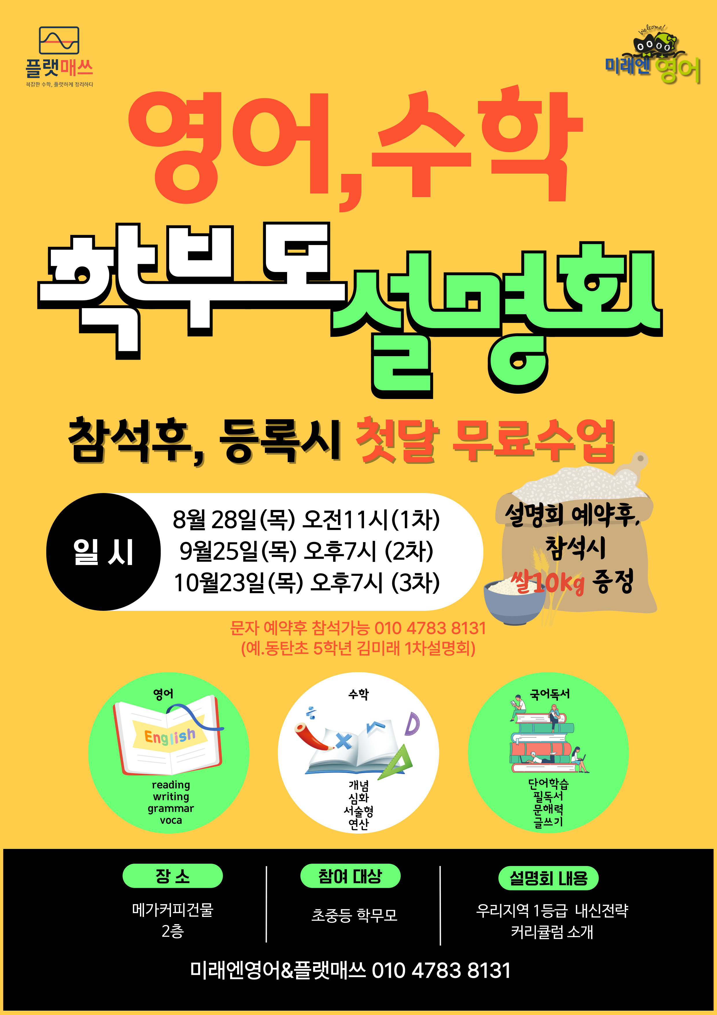우리 학원은 **매쓰플랫 프리미엄(MathFlat Premium)**을 활용합니다! 우리 학원은 학생들의 학습 효율을... 상담 신청하시면, 자녀에게 꼭 맞는 학습 플랜을 제시해드립니다. 수학상담: 010******** 영어상담: 010********