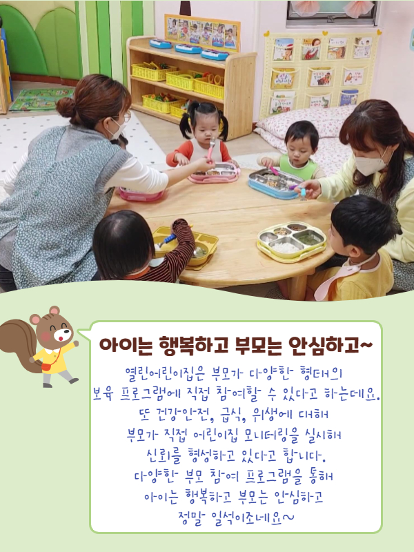 오늘은 옹기종기 어린이집과 예빛어린이집에서 방문하셨어요~!! 친구들과 함께 “쑥쑥이 건강 교실” 책으로 건강하고 골고루 먹는 다양한 이야기를 하면서, 스티커도 붙이고, 색칠도 하는 시간을 보냈습니다....