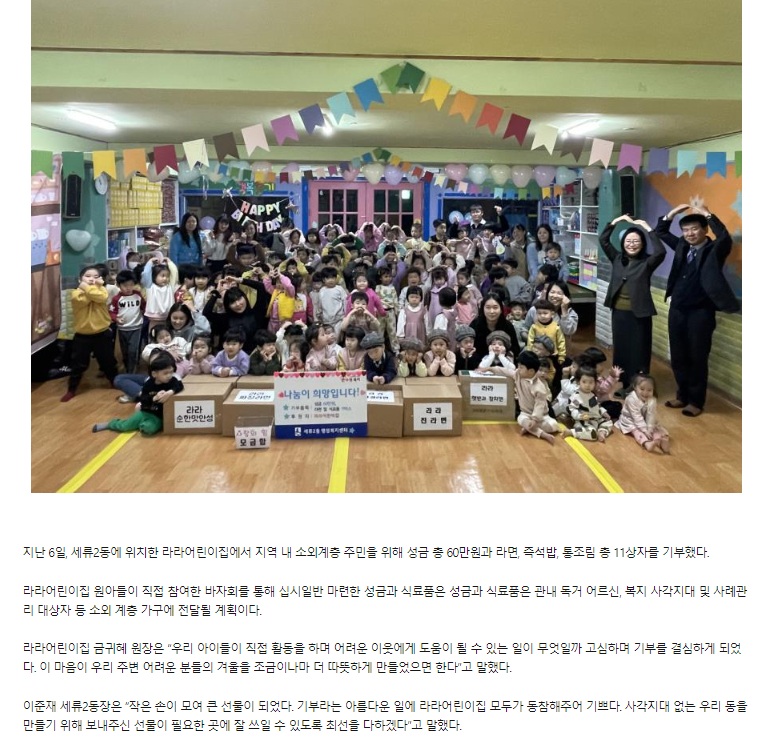 고양시향동종합사회복지관(관장 양복선)은 지난 22일 고양시립라라어린이집(원장 박나연)과 후원금 전달식을 진행했다, 고양시립라라어린이집은 원아들이 참여한 플리마켓을 통해 마련한 수익금 1,074,000원과...