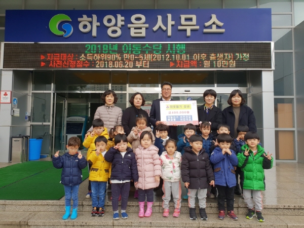 ▲ 후원품 전달 기념촬영 모습 © 온아신문 아산시 배방읍 별하늘어린이집(원장 허의숙)과 별하늘신도시하늘채아파트 입주자대표협의회(대표 노미림)는 지난 29일 배방읍행복키움추진단(공동단장 손정열...