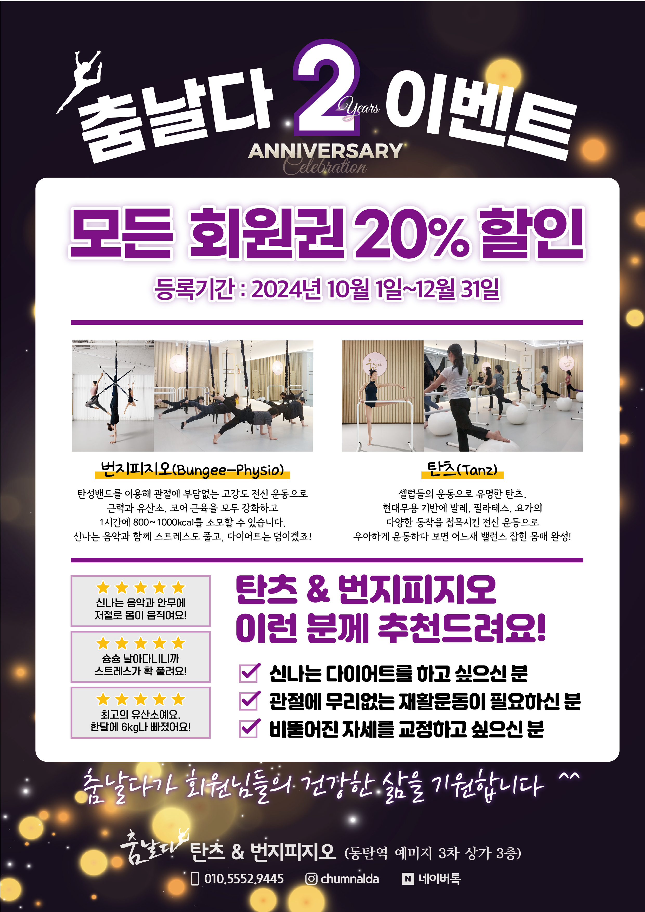 춤날다 탄츠 & 번지피지오 는 동탄 무용학원으로, 번지피지오 뿐만 아니라 탄츠, 탄츠 핏, 번지 요가 등 다양한 커리큘럼을 제공하고 있다. #번지피지오 코어 강화+근력+유산소 1000kacl 소모 가능! 관절 부담...