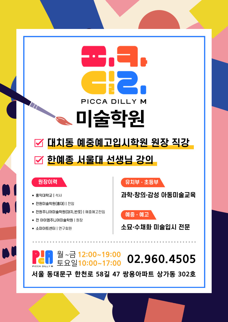 그 순수함과 창의성을 되찾고 싶어 피카딜리M 미술학원을 찾았어요 오랜 전통을 자랑하는 이곳은 미술... 있도록, 피카딜리M에서 새로운 예술적 여정을 시작해 보세요! 010-****-**** #동대문미술학원 #아동미술...