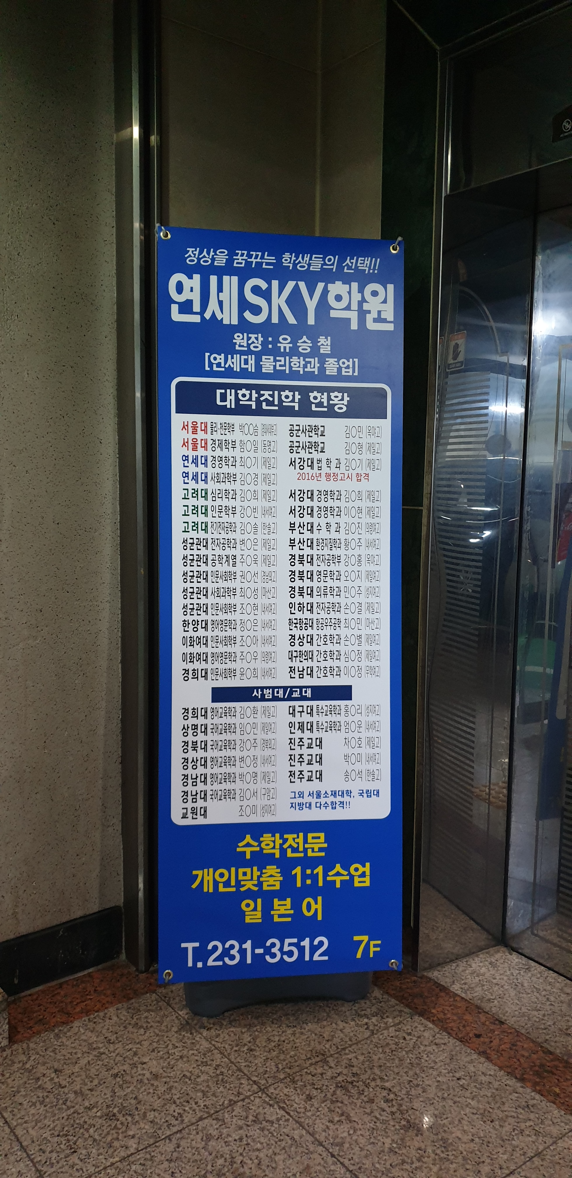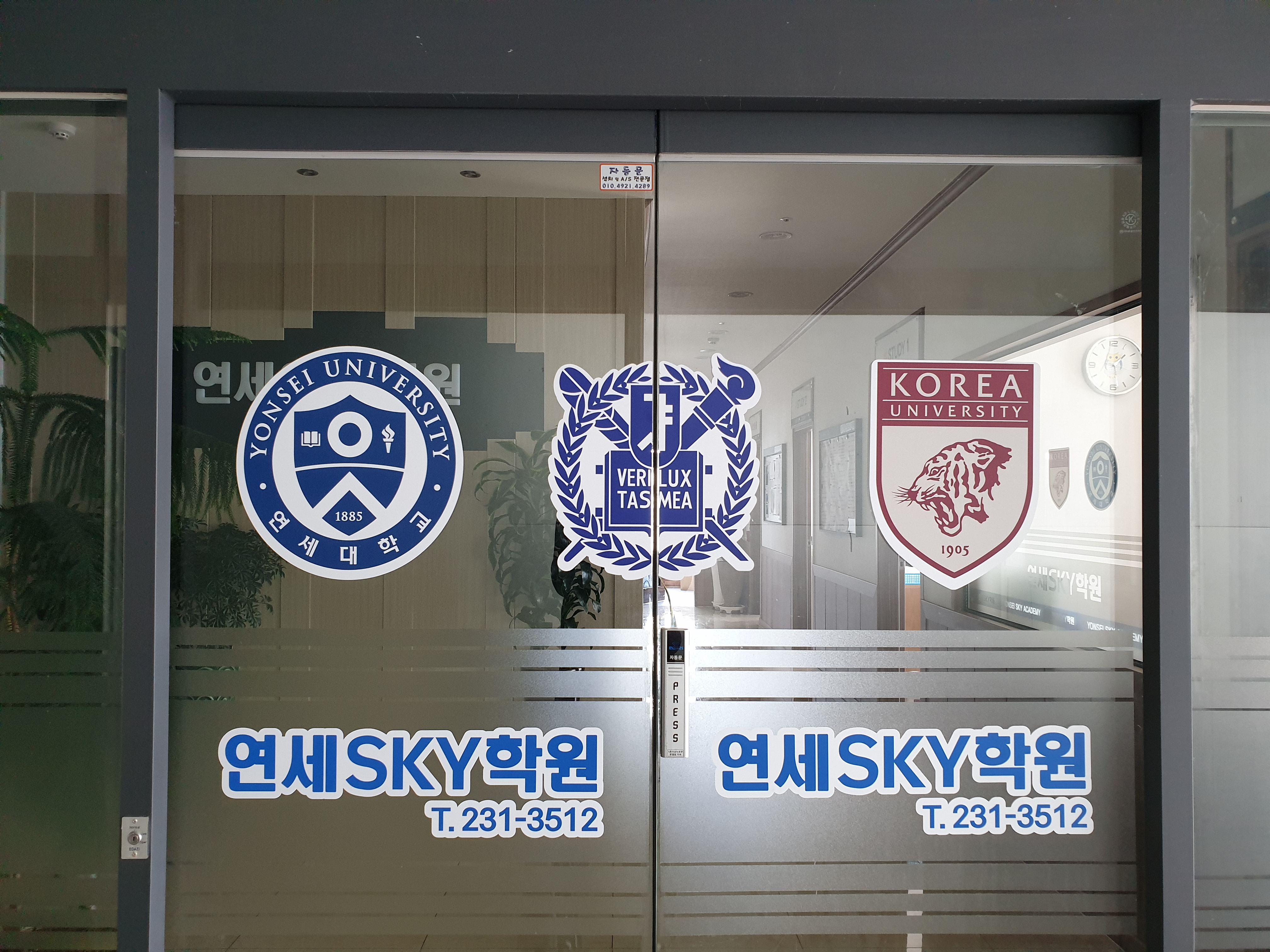 마산 삼계에 위치한 연세SKY학원 외부유리 라텍스실사출력 + LED투광기 시공 삼광광고기획 우남규실장 간판.디자인기획 로고디자인 브랜딩 창원대표 간판전문회사 문의.상담 010-****-****