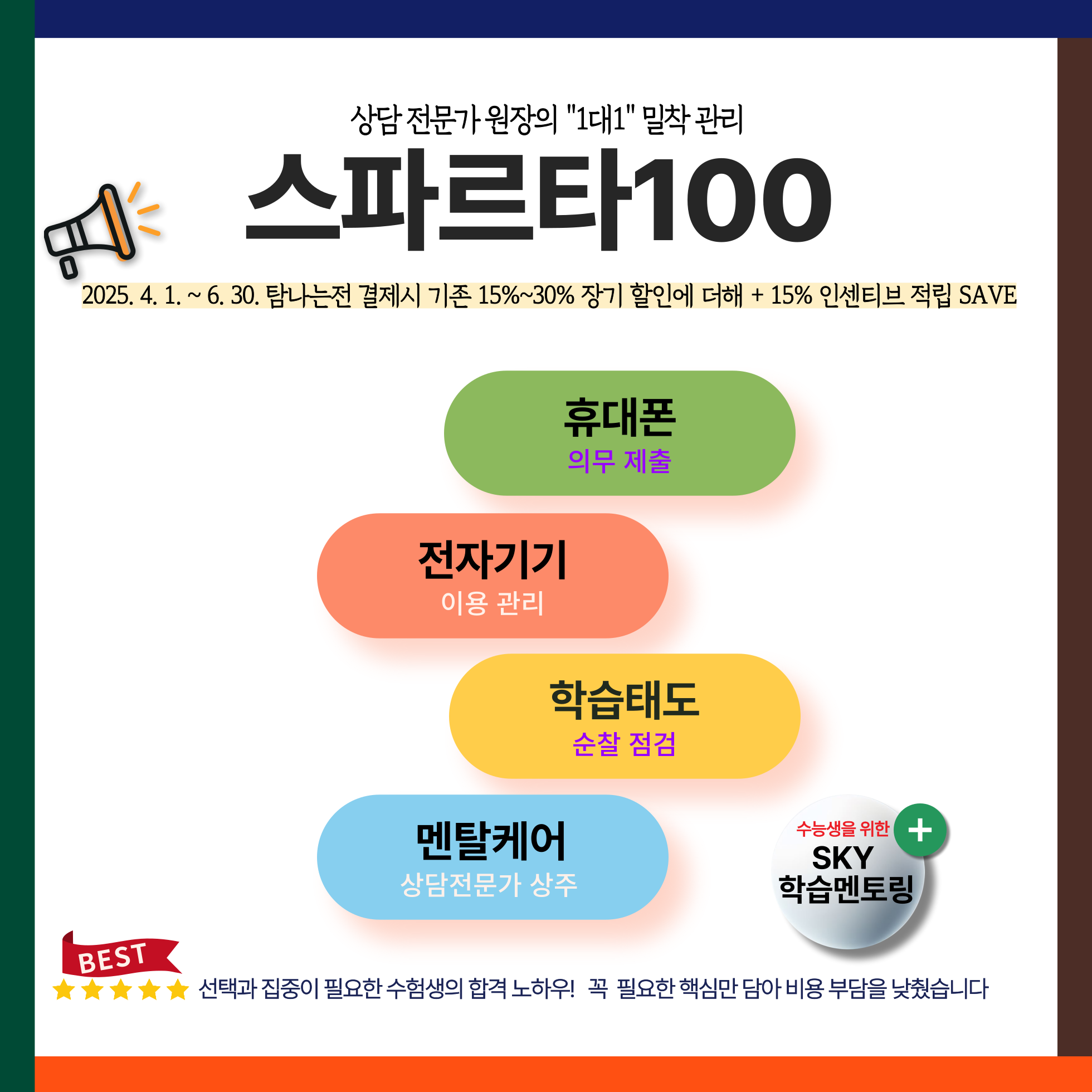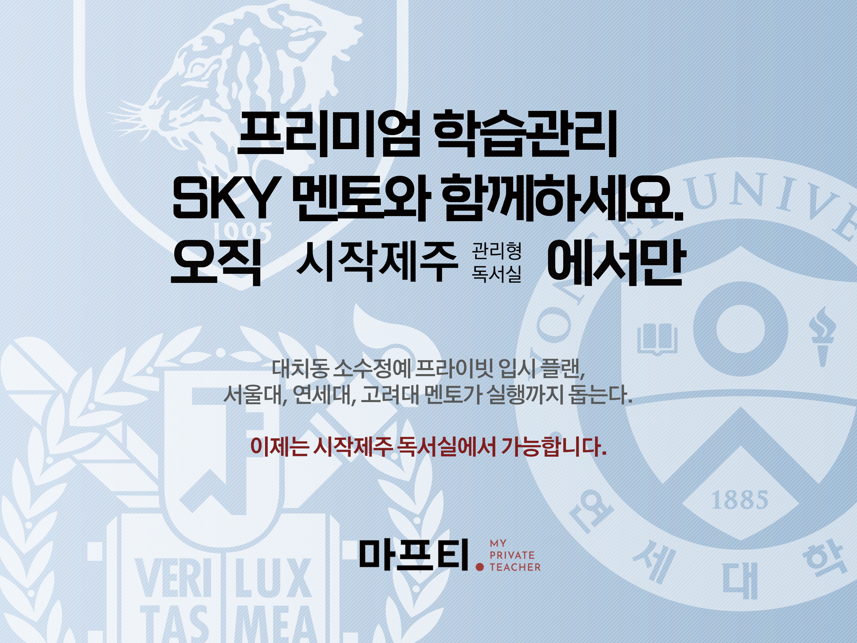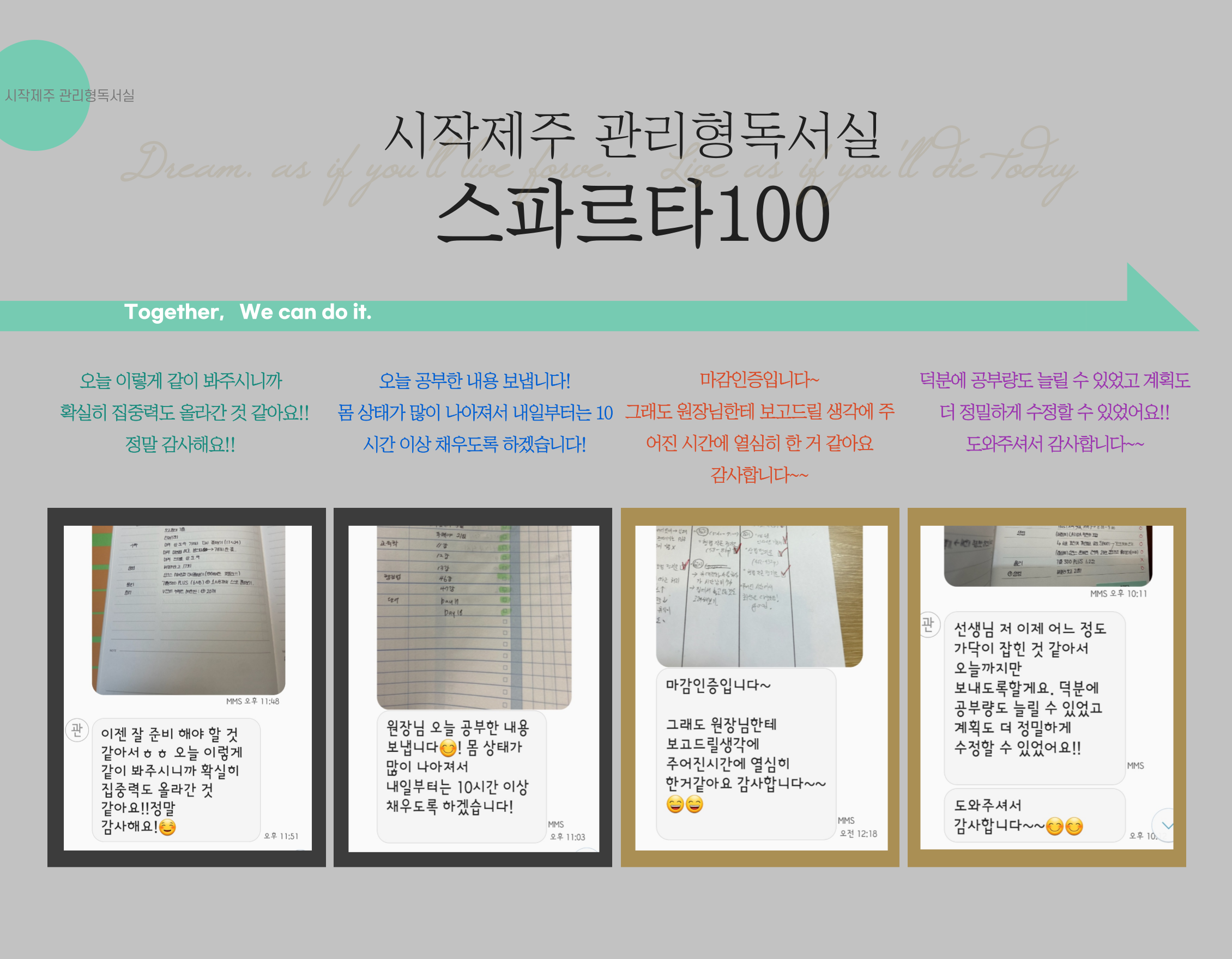상담전문가가 상주 관리하는 관리형독서실은 시작제주독서실이 유일합니다. 맞춤형 관리가 가능한 시작제주관리형독서실에서 시험 당일까지 슬럼프없이 끝까지 열공하여 바라시던 목표 꼭! 이루시길...