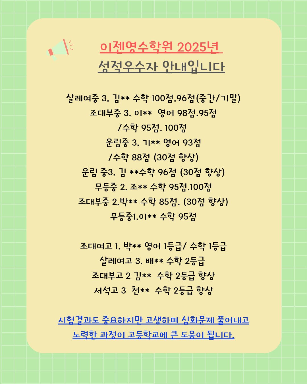 삼산이젠수학영어학원입니다. 2025학년도 중등 기말고사에서 우리 학원 학생들이 이번에도 눈에 띄는 성과를 보여주었습니다. ⭐ 학생들의 꾸준한 노력과 체계적인 학습 관리가 만들어낸 값진 결과입니다....