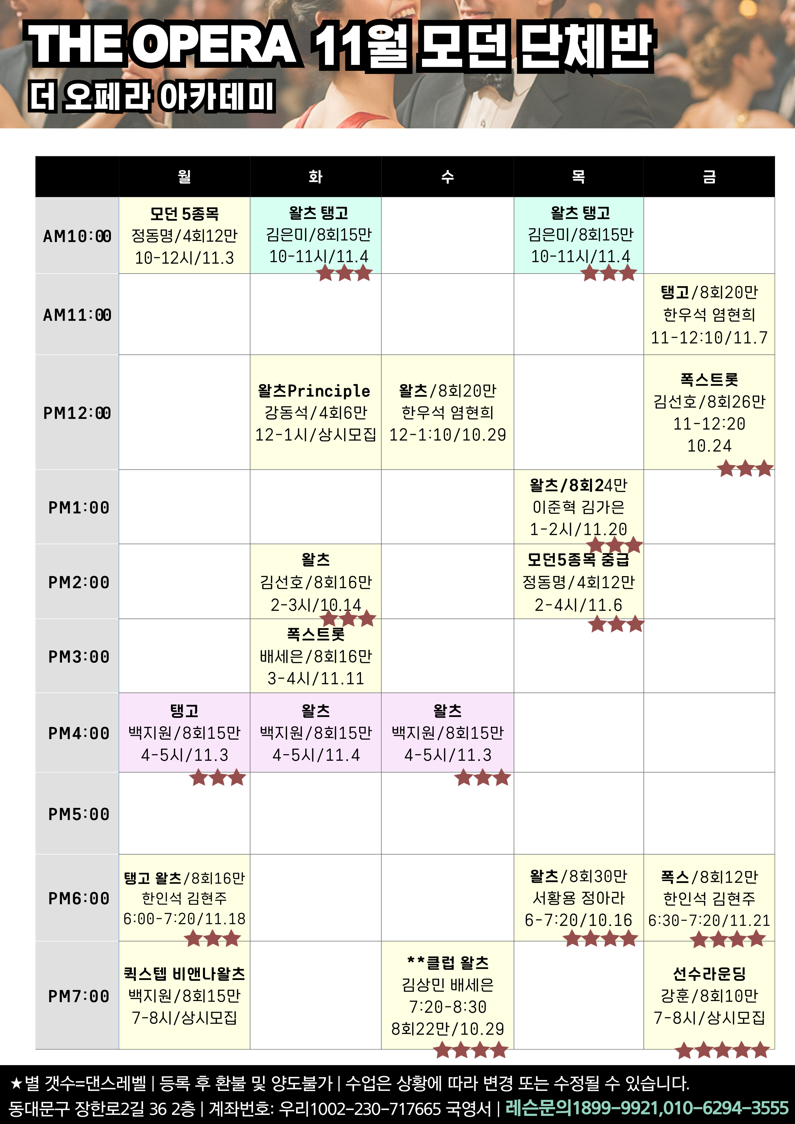 광주 오페라 라인댄스, 댄스스포츠(룸바 차차차 자이브) 시간표