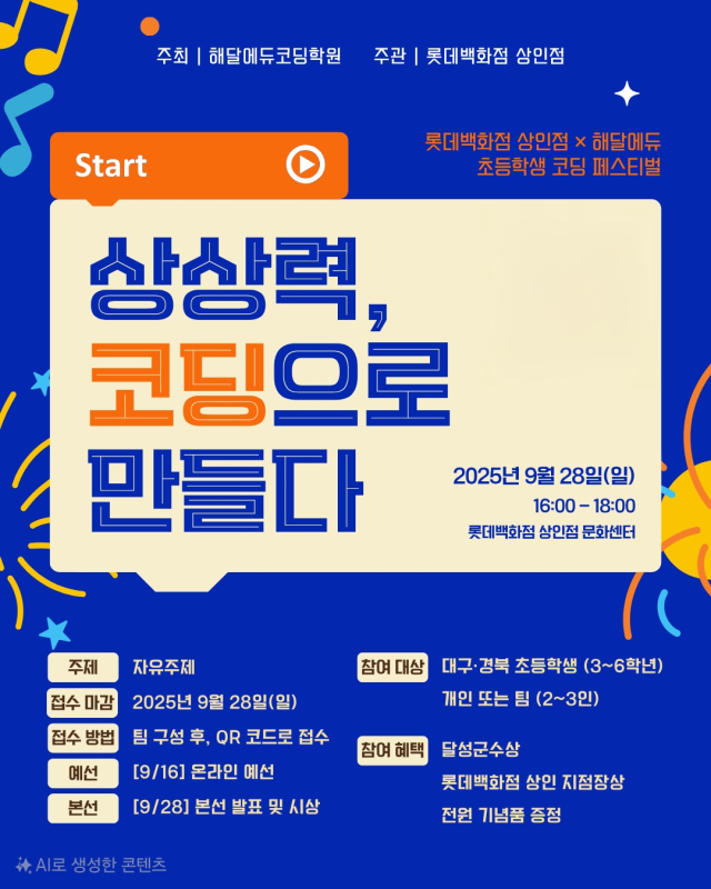 롯데백화점 상인점, 미래 인재 양성 위한 ‘코딩 페스티벌’ 개최 주최 해달에듀코딩학원 후원 달성군청 '상상력, 코딩으로 만들다!' http://www.jinju.news/front/news/view.do?articleId=ARTICLE_00037841...