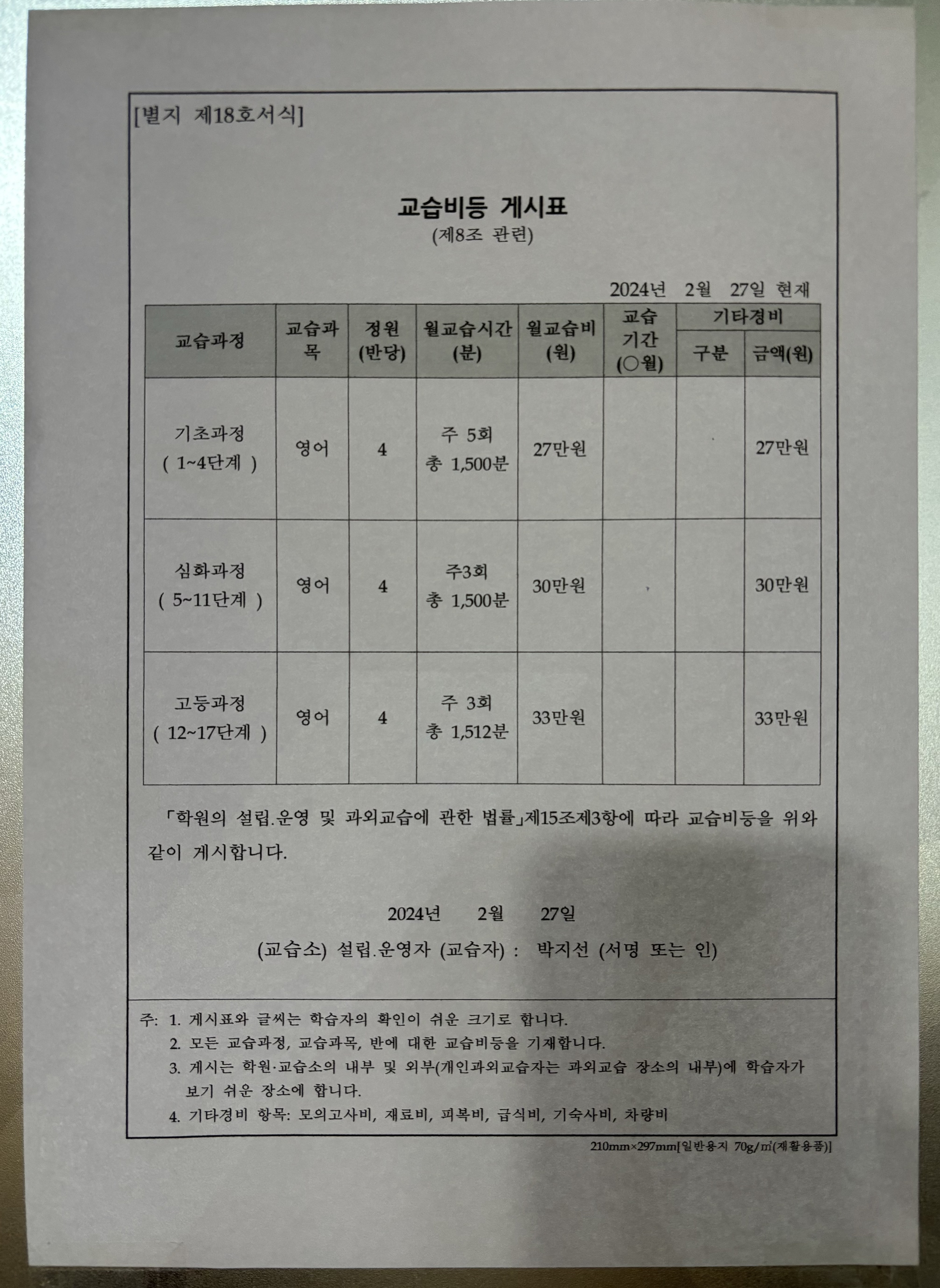수락초 윤선생우리집앞영어... 영어교습소 교습비 등 게시표...