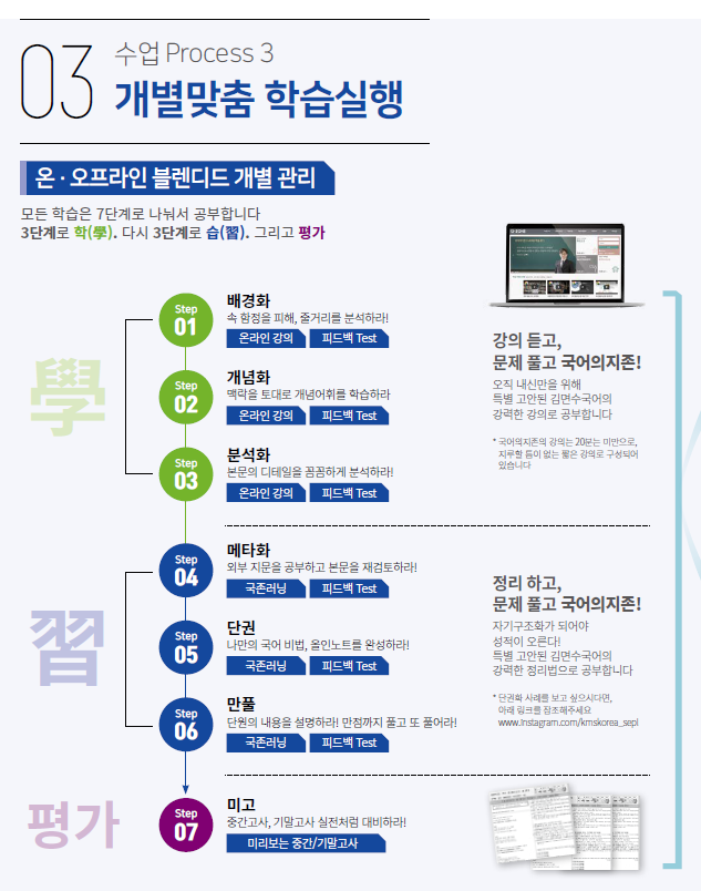 그렇다면 공부의지존, 동춘동국어학원에서 진행되는 강의는 어떻게 다를까요? 강의로 온라인을 통해 개념을 익히고 오프라인을 통해 피드백과 학업 관리를 받을 수 있는 국내에서는 유일무이한 자기주도학습의...