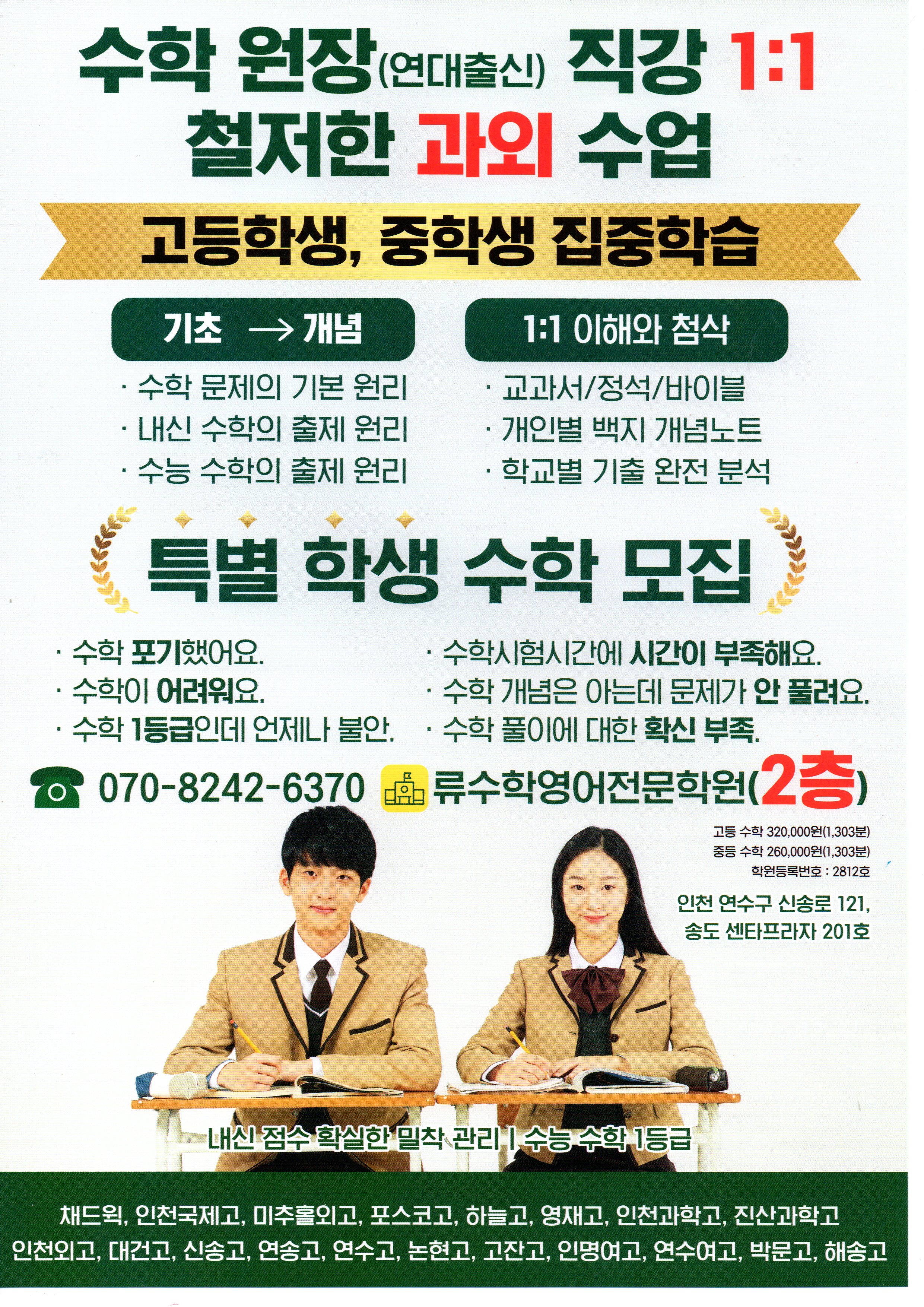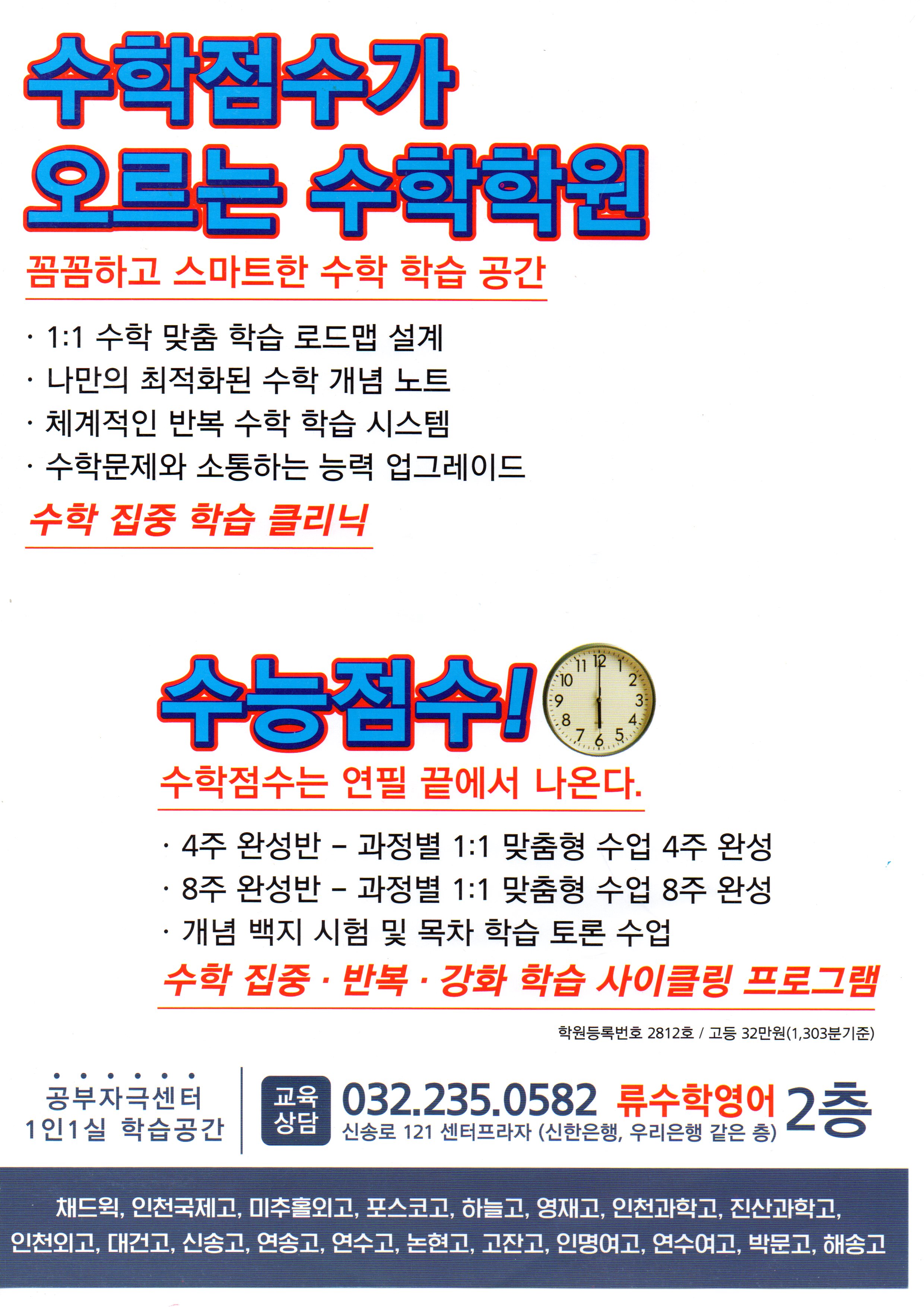 함께 진단해 보겠습니다." 아이의 현재와 목표를 함께 이야기 나눠보고 싶으시다면 상담은 언제든 열려 있습니다 류수학영어학원 안내 송도수학학원 류수학영어전문학원 대상 : 중 고등 영어수학전문 강점 : 1...