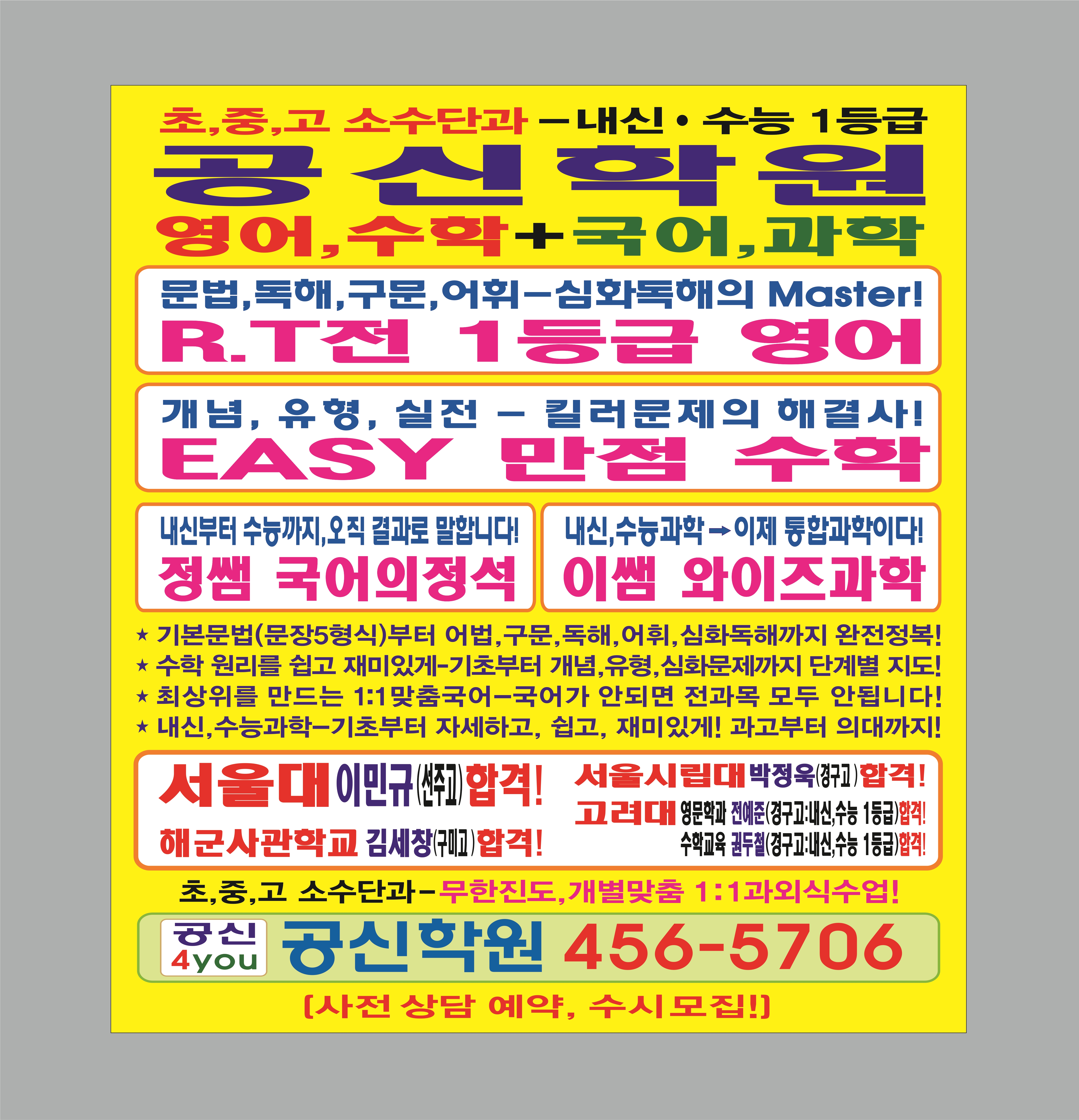 저희 공신학원은 학생들에게 오하이오 주립대학교 언어학을 전공한 원장 직강의 차별화된 수업과... 2학기 내신 대비를 위해, 공신클럽 학원은 아래의 방향으로 준비할 예정입니다. 어디에서 공부하느냐에...
