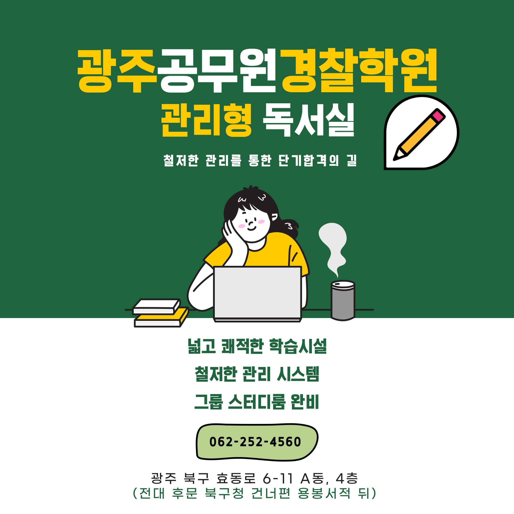 공무원 시험 소식 및 할인 이벤트 소식 광주공무원경찰학원 팔로우하고 놓치지 마세요! 광주공무원(경찰)학원 관리형 독서실 전화문의 운영시간 062-252-4560 매일 08:00A.M~ 23:00P.M 유선문의(062-262-4560)는 월~토...