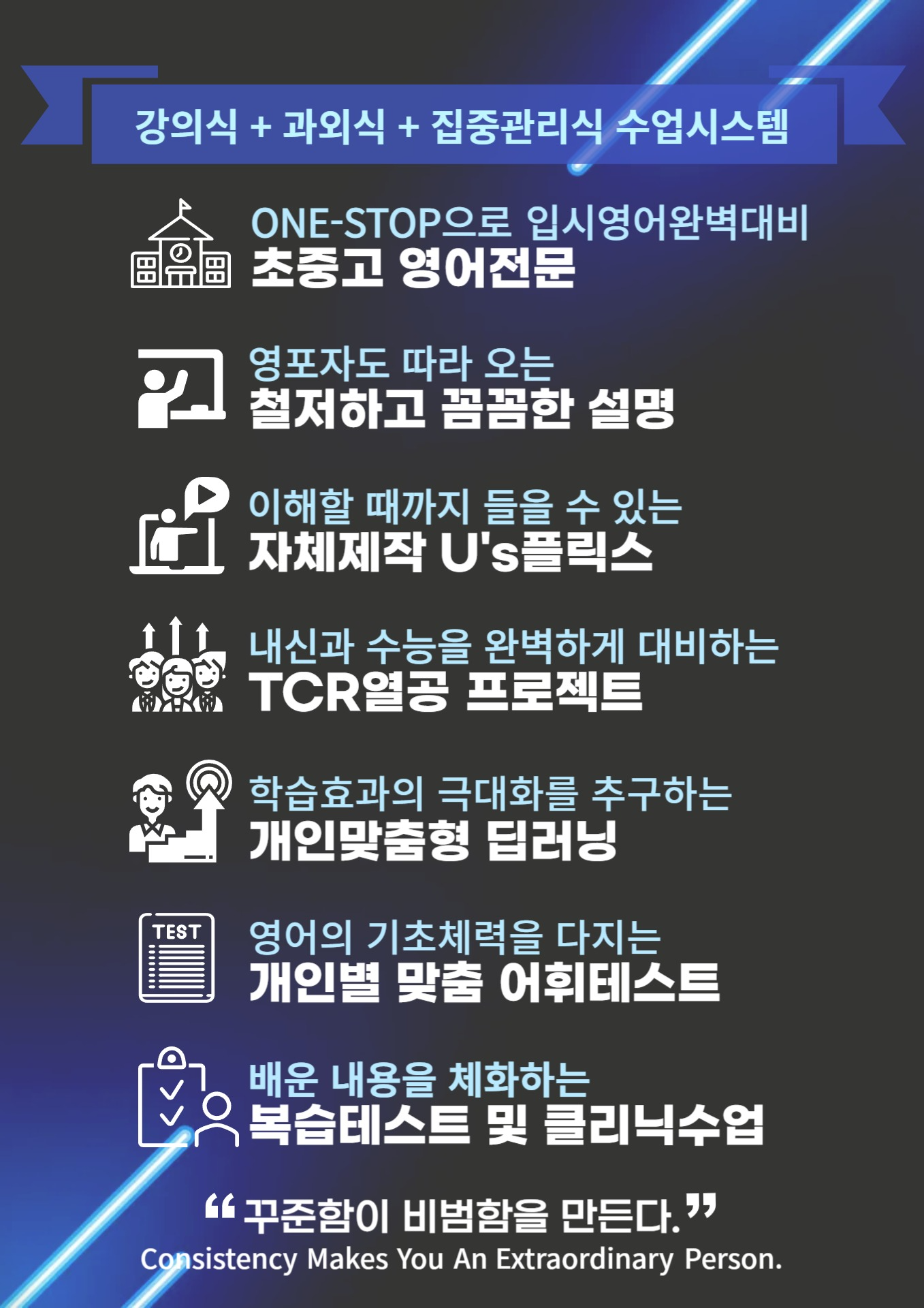 성균관대 영문학 석사 출신 DH 원장님의 직강을 중심으로 운영되며, 전문성과 관리력 두 가지를 모두 갖춘 학원으로 학부모들 사이에서 높은 신뢰를 받고 있습니다. 레벨업영어학원의 가장 큰 특징은 ‘강사의...