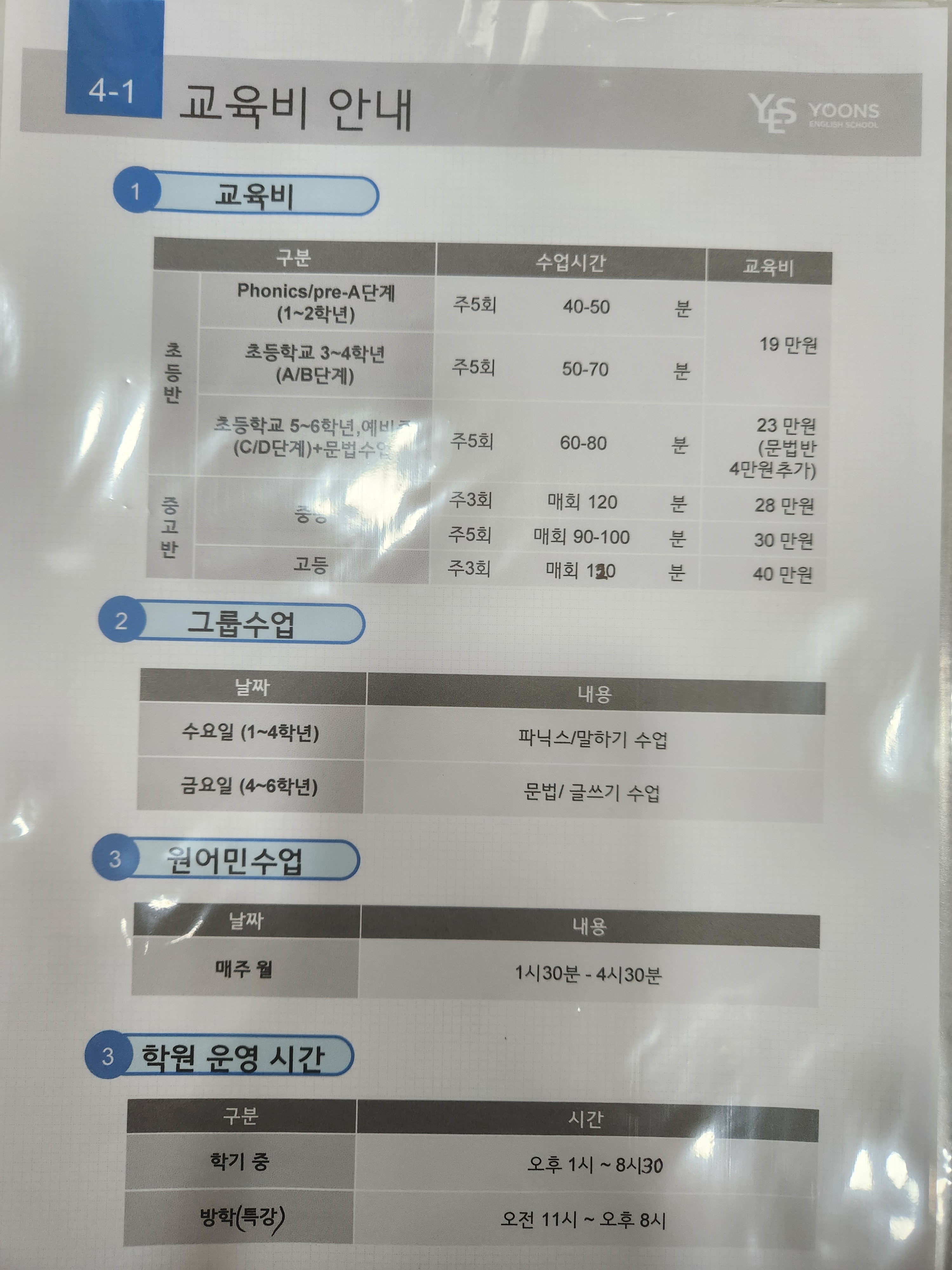 윤선생영어숲 우장산 학원입니다. 오늘은 저희 학원의 교습비등 게시표 및 교습비 반환기준 안내와 학원 설립 운영등록증명서를 안내해드립니다. 학원입구와 학부모님들께서 상담실에 들어오셔서 보실수...