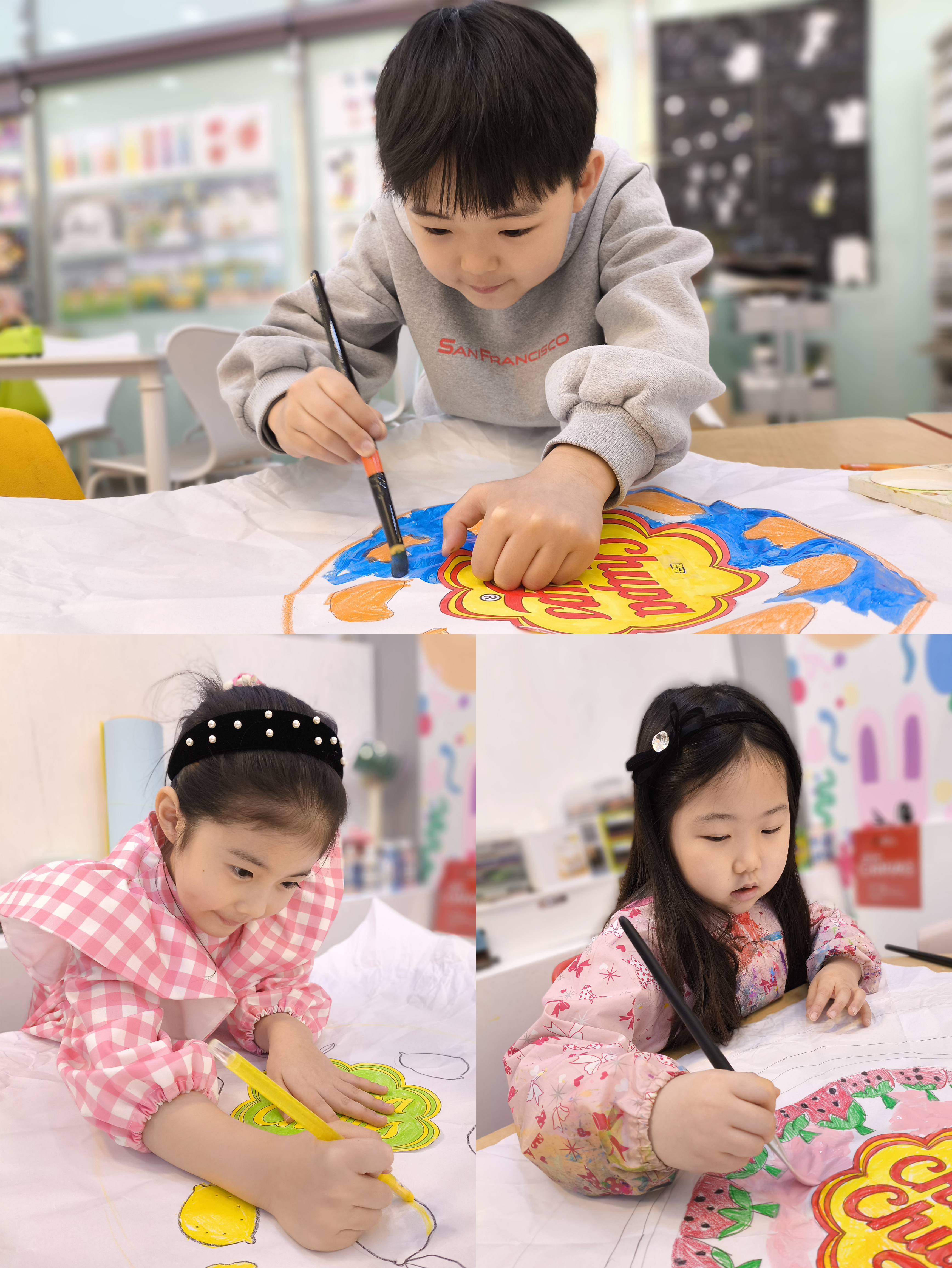 초3남아 / 크레파스 색연필,물감 혼합/ 화이트초콜렛을 좋아해서 초콜렛가게를 그려넣었고 제목은 '어서오세요!' 초5여아 / 물감 사용 /그림별쎄라 미술교습소를 그려넣었고 옆가게인 with me 편의점도...