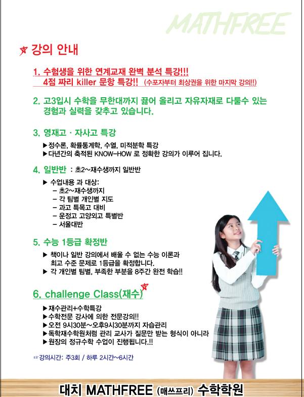 원하시면 매쓰솔루션에서 아이를 맡겨주세요. 학생들 하나하나 체크해 가면서 확실하게 개념을 익히고 많은 문제들을 풀면서 재미있게 공부하는게 가능한 곳이 바로 여기 입니다. 제 수업을 듣다보면 수학도...