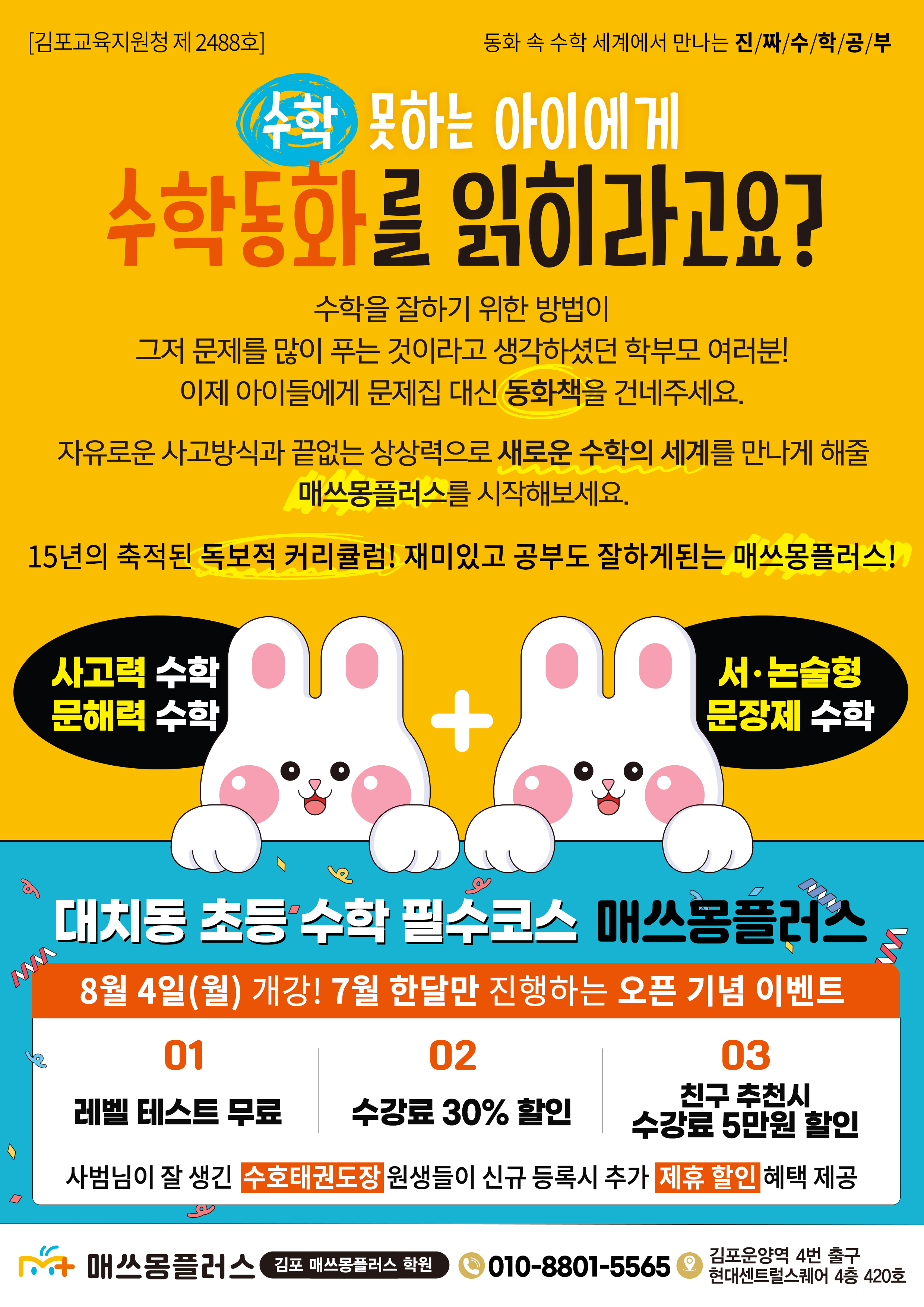 김포 매쓰몽플러스 대치동셈수학 학원 9/8 정식 개강! 오픈기념 이벤트 안내 운양동에서... 장기동초등수학학원 #청수초수학 #하늘빛초수학 #초등연산 #문해력수학 #매쓰몽플러스 #대치동셈수학 #사고력수학