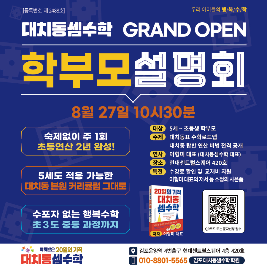 구미호수학을 보내고 계신 학부모님들은 대부분 아실거에요~ 매쓰몽플러스와 대치동셈수학의 엄청난... 평소 특강프로그램을 찾고계신 원장님들과 학원분들은 꼭 참석하셔서 특별하고 매력적인 프로그램으로...