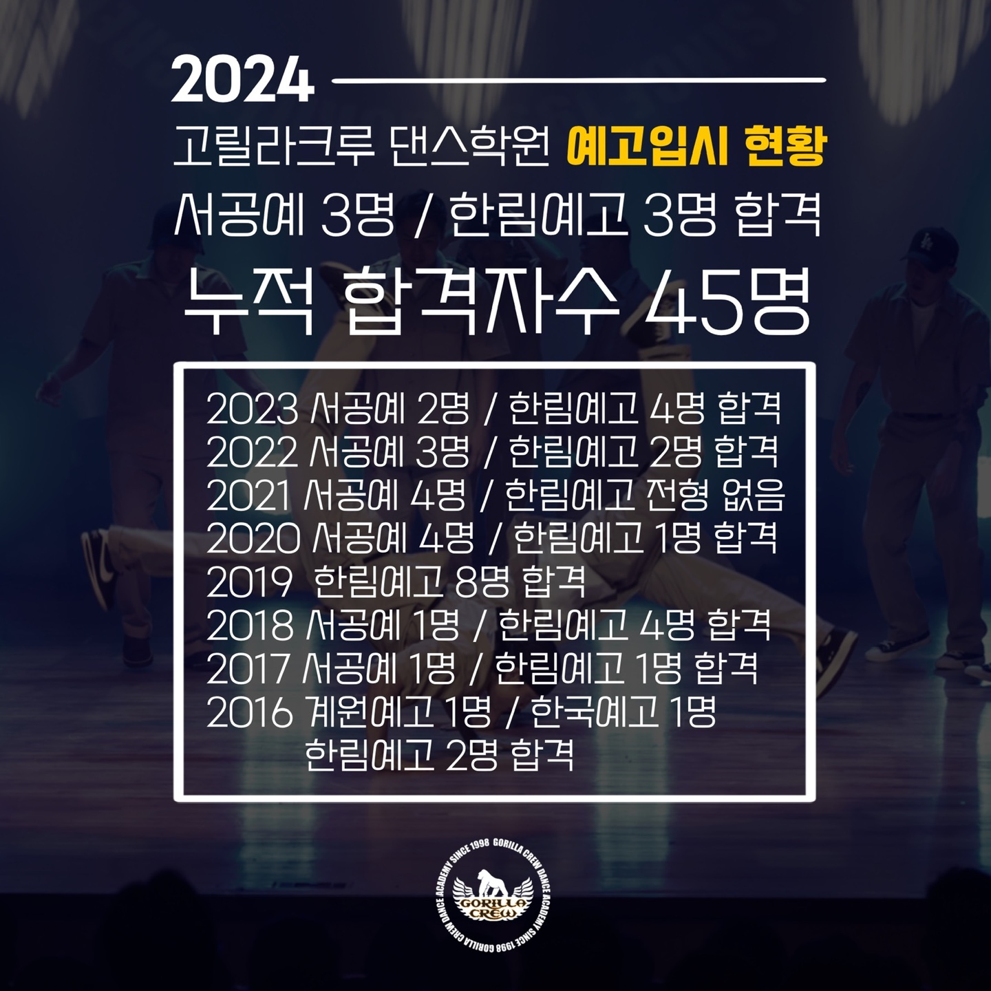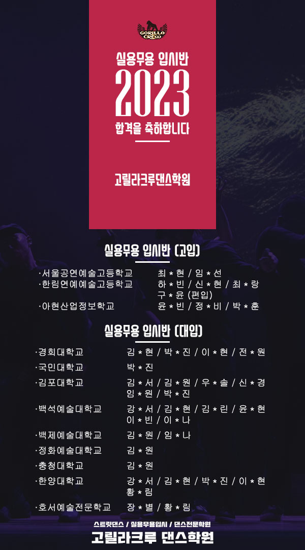 고릴라 크루댄스학원 죽전점 입시반으로 2년동안 있었는데 원생으로서 실제 후기를 써드리려고 합니다 우선 학원에서 수업하는 장르는 k-pop/힙합/하우스/왁킹/락킹/브레이킹/소울/걸스힙합/힙합코레오/코레오...