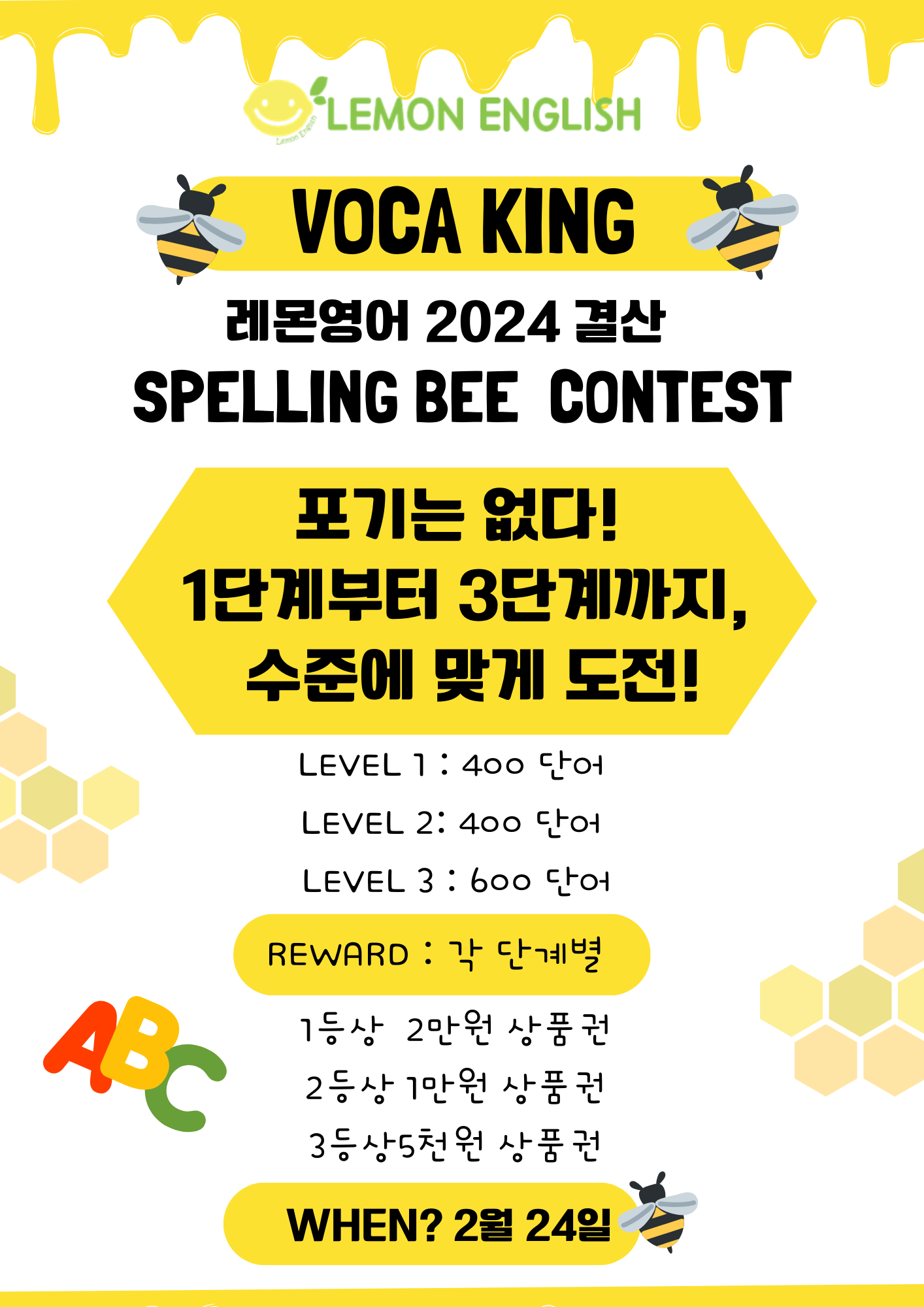 캘런어학원 캘런어학원에서 레몬을 많이 모으려면 출석률, 숙제뿐만 아니라 단어 시험, 먼슬리 테스트 등 다양한 대내외 시험에서 좋은 성적을 받아야 해요! 그럼 다시 일상으로 돌아가 열심히 공부해 봅시당...
