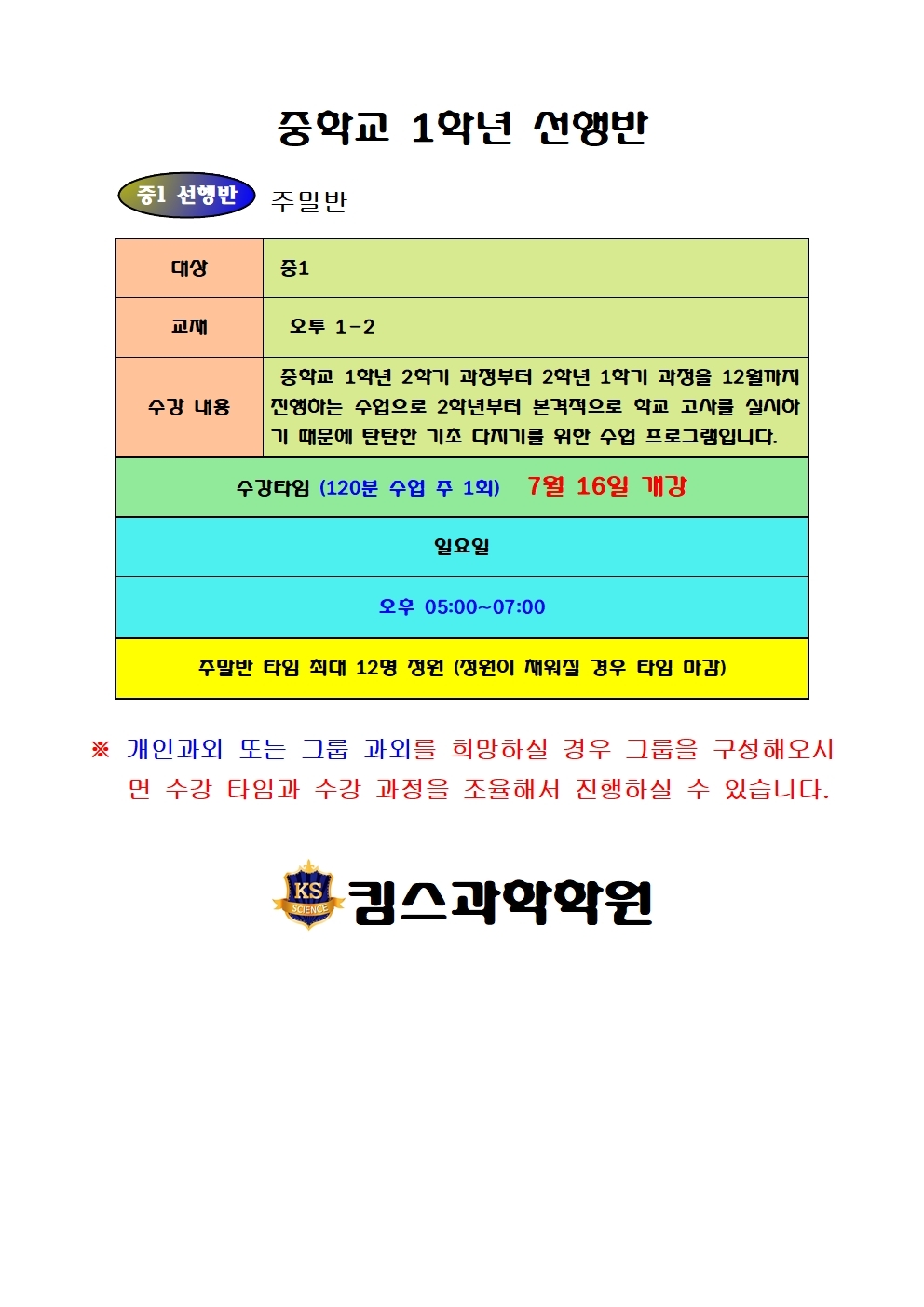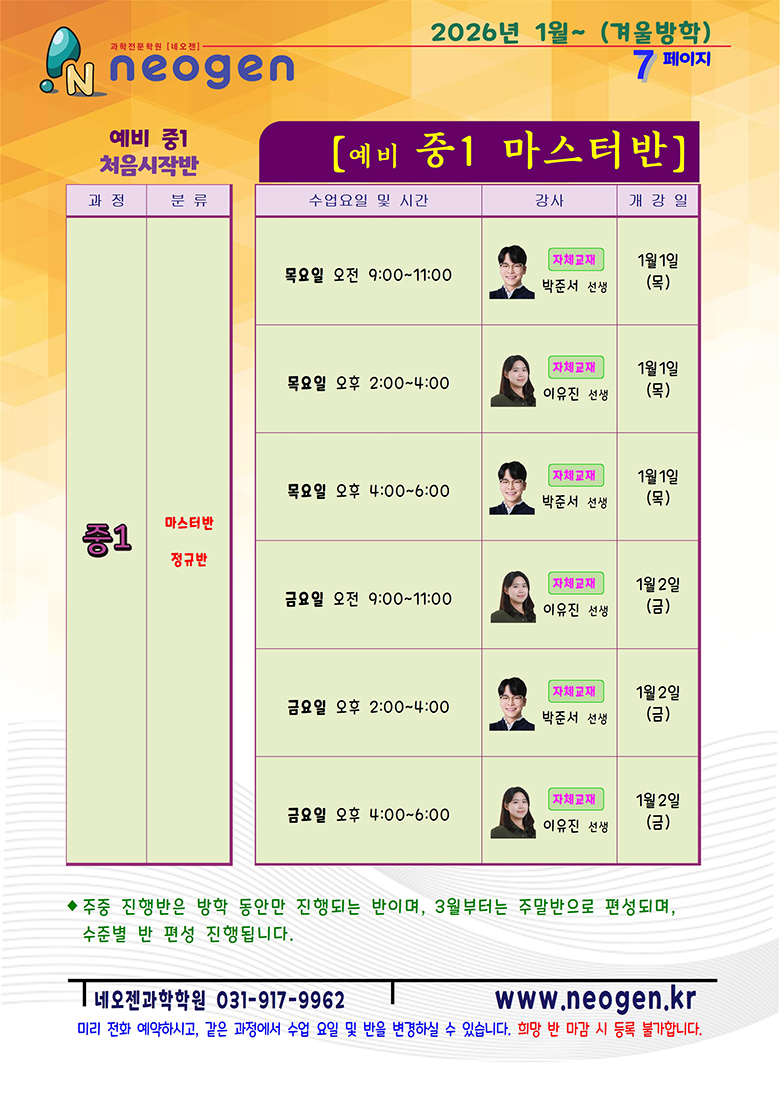 평촌이찬화과학학원에서는 '생명과학' 뿐 아니라 2학기 유전을 대비한 '생물의 유전'을 겨울에 함께 오픈합니다. 커리큘럼은 다음과 같습니다. 이번주부터 예비고2 과정이 오픈되니 많은 관심 부탁드려요~ 수강...