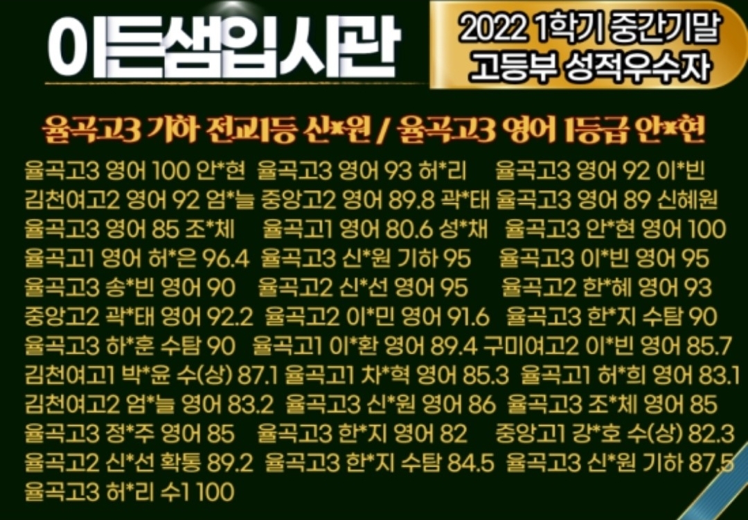 율곡동 영어학원 수학학원 입시 명가 이든샘영수학원은 초등부, 중등부, 고등부 영어 수학 전문학원으로 김천시 용전1로 67(율곡동 418), 2층에서 운영되고 있는데, 이런 이든샘영수학원에서 2025년 7월 19일...