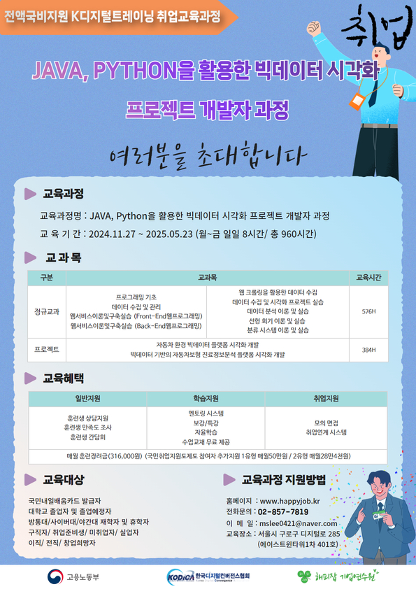 [해피잡기업연수원/자바국비학원] 해피잡교육학원에서 진행하는 K디지털트레이닝 JAVA, Python을 활용한 빅데이터 시각화 프로젝트 개발자 과정 소개합니다. 이 교육과정은 it개발자 취업을 준비하는...