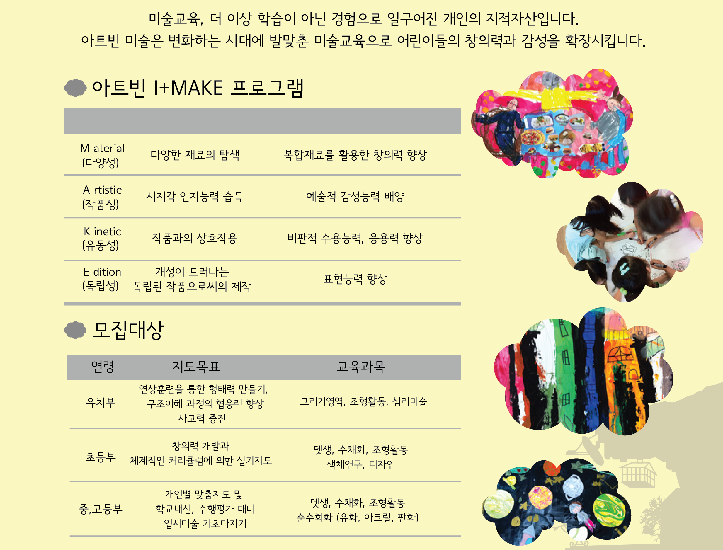 저희 아트빈 미술 교습소는 2014년 용인시 수지구에 개원해 약 7년차를 맞이한 유아동 창의미술 교육 센터 입니다. 주로 학원 주변 미취학/초등학생 아동들을 대상으로 다양한 미술 활동을 교육하는 곳이라...