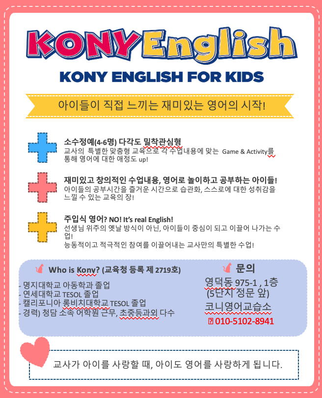 행복한 영어를 시작할 수 있도록 코니쌤이 함께 하겠습니다♡ 상담 전에 또는 상담 후에 1:1 개인 무료... 여기는 코니영어교습소 입니다♡ 코니영어교습소 신규모집 안내 *위 이벤트는 중복 적용이...