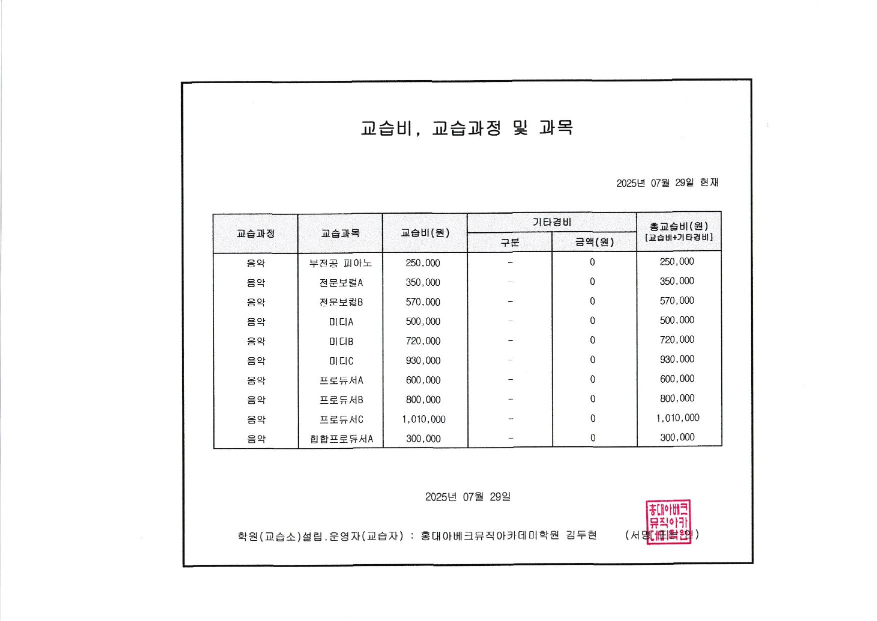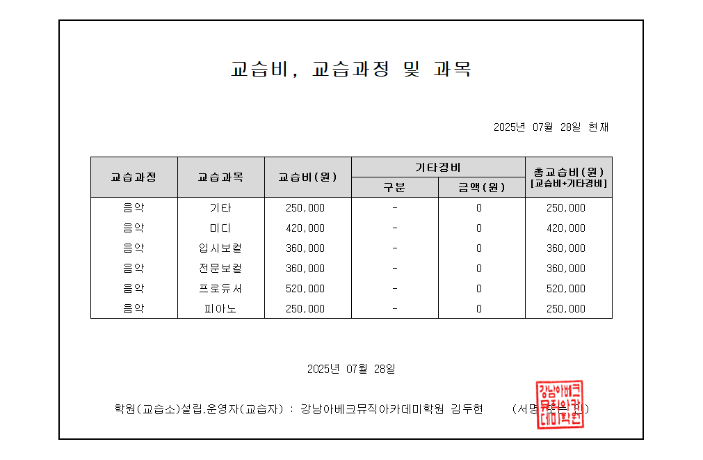 레슨악기 및 시간, 레슨비 안내/ 애크미실용음악학원 소사벌...